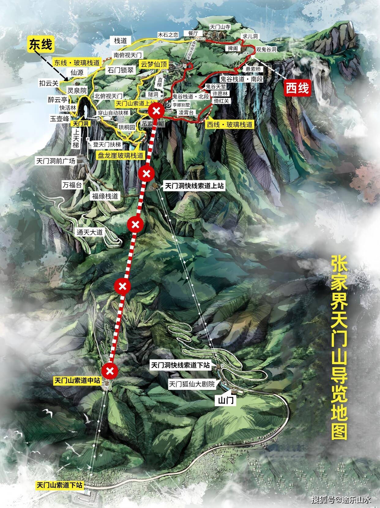 门票+天门山索道上行+天门洞快线级穿山扶梯上行+天门山索道下行(2线交通项目略有调整,建议结合游路选择)。