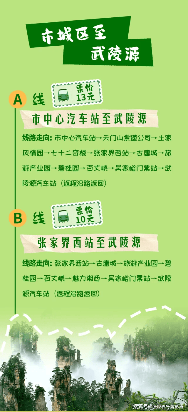 线路一:市区(中心汽车站)⇋天门山⇋七十二奇楼⇋张家界西站⇋魅力湘西⇋武陵源(张家界国家森林公园.东门)